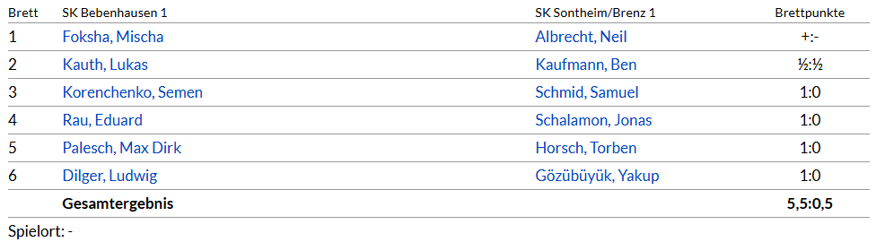 Den Gastgebern kam sicherlich entgegen, dass die Brenztäler ohne ihren Spitzenspieler, den frischgebackenen Deutschen U14-Meister Neil Albrecht antraten. Auf Grund von Personalproblemen ließ Sontheim sogar das 1. Brett unbesetzt, so dass Mischa Foksha zu einem kampflosen Punkt kam. Einmal mehr eine fragwürdige Eröffnung spielte Semen Korenchenko, der jedoch an Brett 3 mit seiner ganzen Routine in ein gewonnenes Endspiel abwickeln konnte. Max Palesch (Brett 5) verwertete seinen früh gewonnen Mehrbauern souverän zum 3:0 und Eduard Rau (4) war es vorbehalten, mit einer sehr starken Partie bereits den Mannschaftssieg unter Dach und Fach zu bringen. Eine schwache Partie sahen die Zuschauer an Brett 6. Ludwig Dilger stand aus der Eröffnung heraus auf Gewinn, nach mehreren Fehlern auf Verlust und nach fürchterlichen Fehlern seines Gegners schließlich wieder auf Gewinn. Ebenfalls nicht hasenrein war die Partie von Teamchef Lukas Kauth (2), der froh sein konnte, am Ende mit einer Punkteteilung davonzukommen.